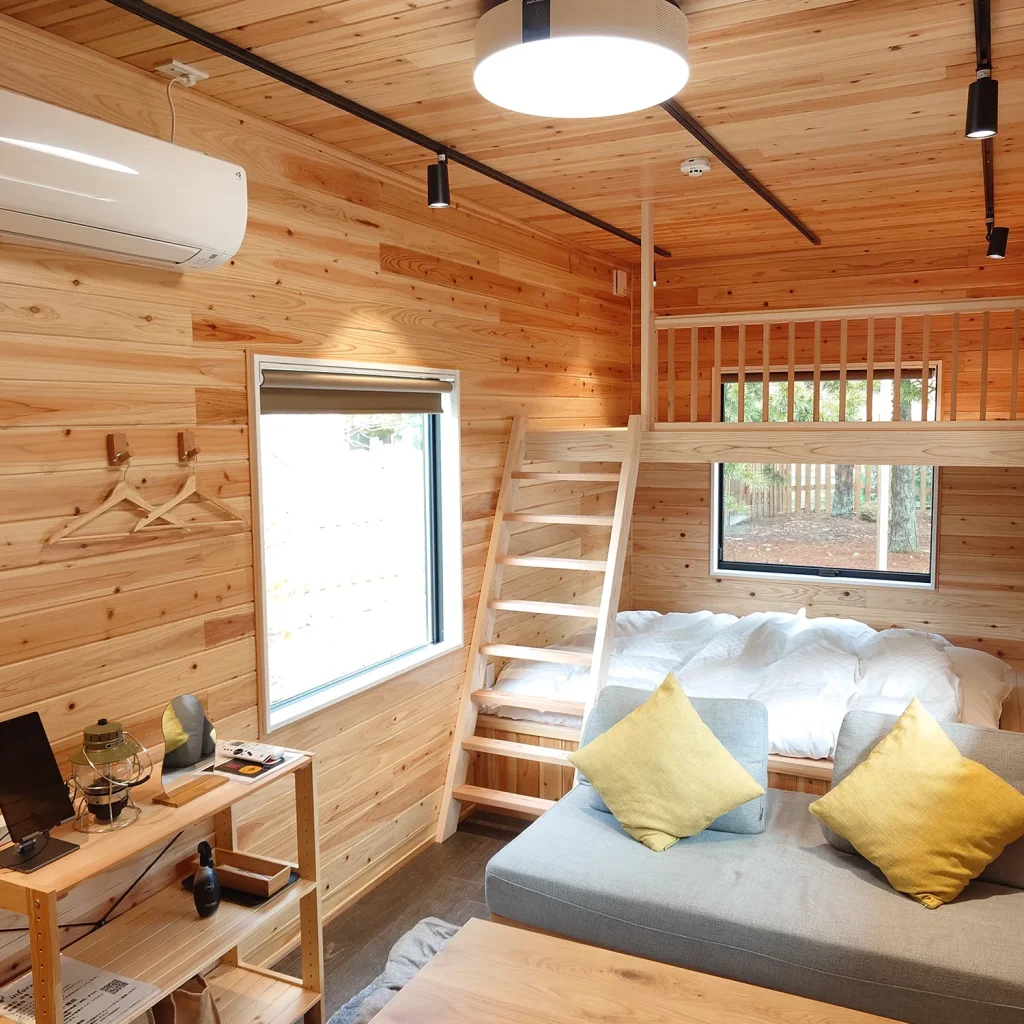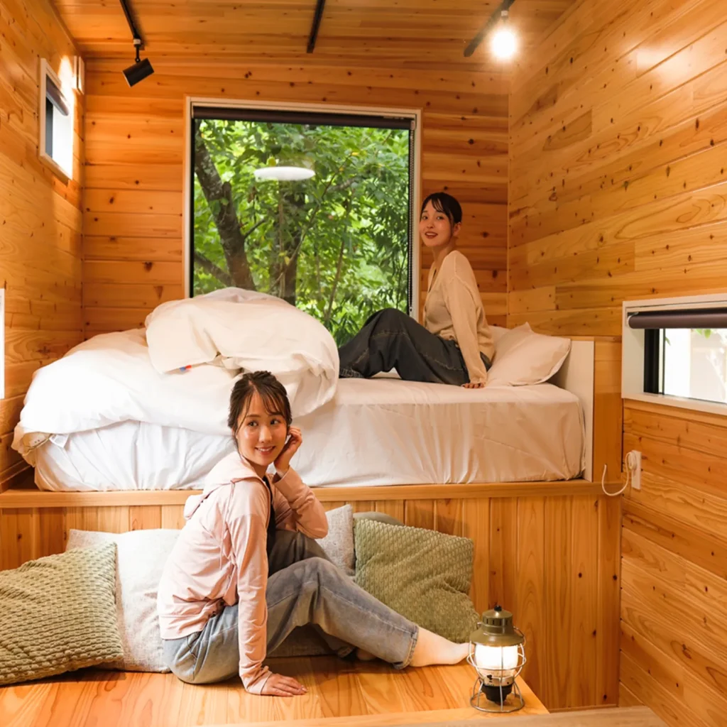 どのタイプもベット付き。ロフト付きや二段ベット、冬季はこたつのトレーラーもあり。リモートロック(暗証番号式)で非対面のチェックイン・アウトが可能です。