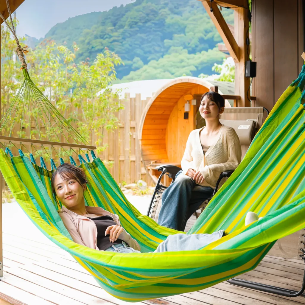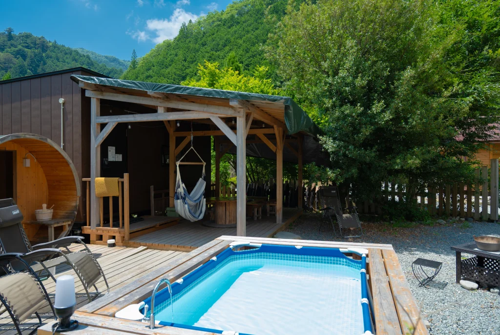 デッキ、チェア、テーブル、タープ、焚き火台、BBQコンロ、網、トング、火バサミ、ゴミ箱、バレルサウナ、山水の水風呂、炭3kg、薪3kg